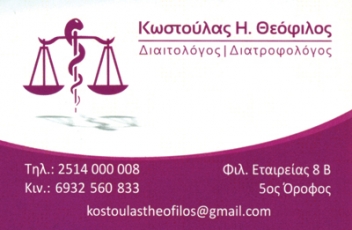 Ο ΚΩΣΤΟΥΛΑΣ ΘΕΟΦΙΛΟΣ είναι διαιτολόγος - διατροφολόγος, μέλος της Ένωσης Διαιτολόγων Διατροφολόγων Ελλάδος, με διαιτολογικό γραφείο στο κέντρο της Καβάλας, και είναι εξωτερικός συνεργάτης στο γυμναστήριο Genesis, καθώς και στο πολυδύναμο κέντρο αισθητικής Novamed.